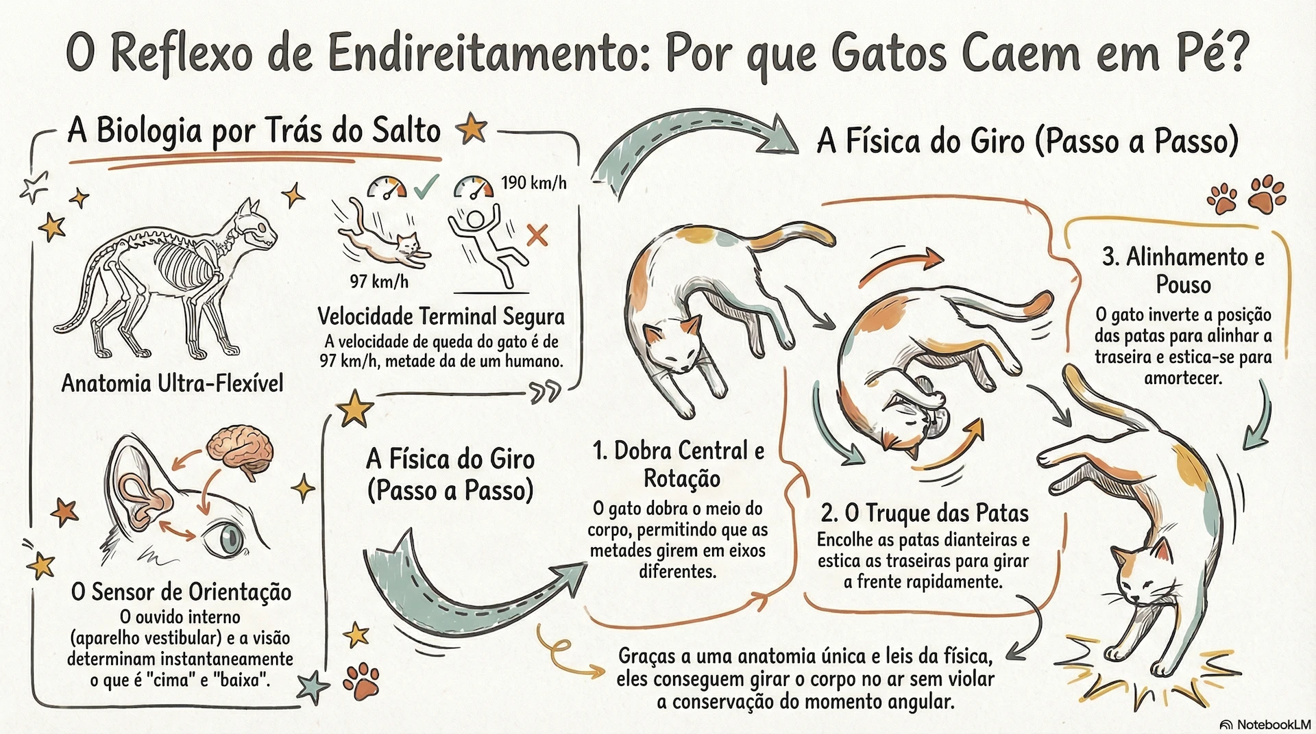 A Física da Queda: Uma Acrobacia Calculada Quando um gato percebe que está caindo, ele usa a visão ou o seu aparelho vestibular (localizado no ouvido interno) para descobrir rapidamente onde é o “para baixo” e o “para cima”. A partir daí, eles realizam uma mágica que respeita à risca a lei da conservação do momento angular: